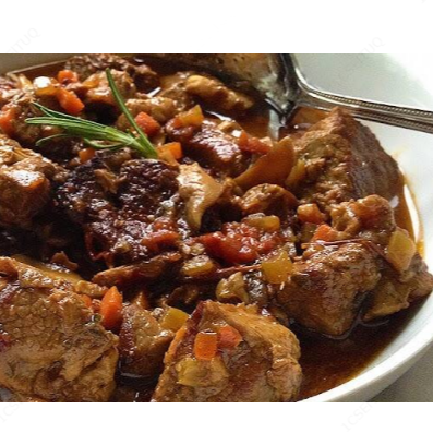 Magnífica carne de bode guisada. Acompanha Feijão, Arroz, Macarrão, Batata na Maionese, Farofa e Vinagrete.