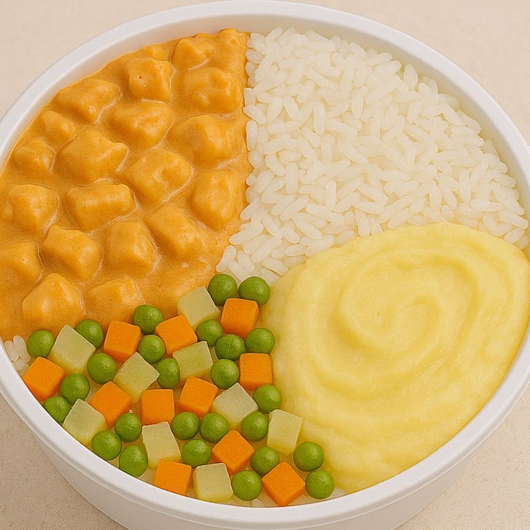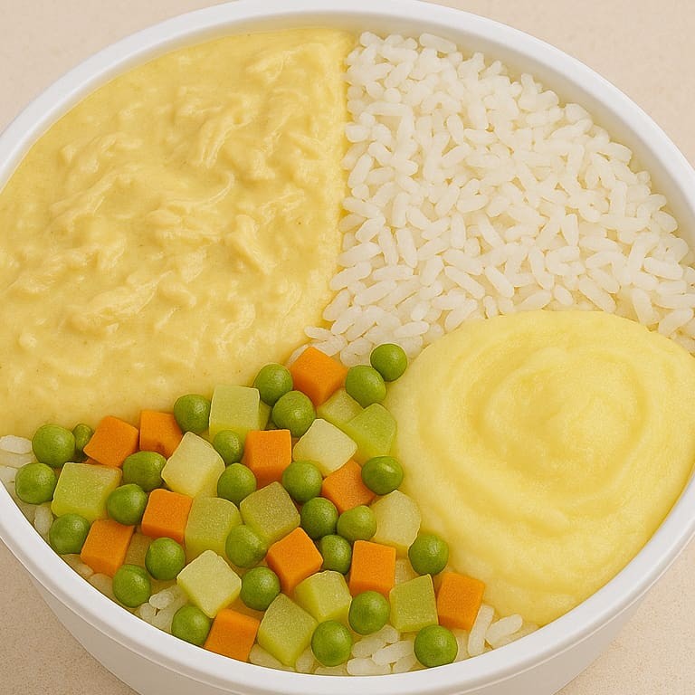 Marmita com creme de frango cremoso com frango desfiado, arroz soltinho temperado, legumes cozidos em cubos (cenoura, batata, chuchu e ervilhas) e purê de batata macio e saboroso. Uma refeição equilibrada e caseira com 500g,