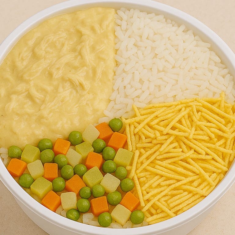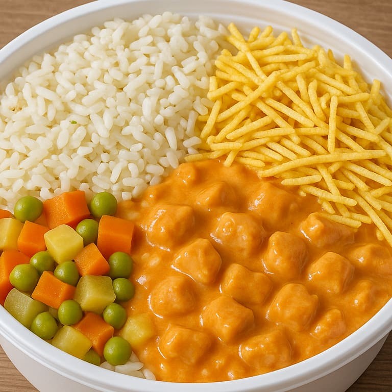 Marmita com delicioso creme de frango cremoso e pedaços de frango desfiado, acompanhada de arroz soltinho temperado, legumes cozidos em cubos e uma porção de batata palha crocante. Uma refeição leve, saborosa e completa, com 500g, ideal para quem busca o sabor da comida caseira.