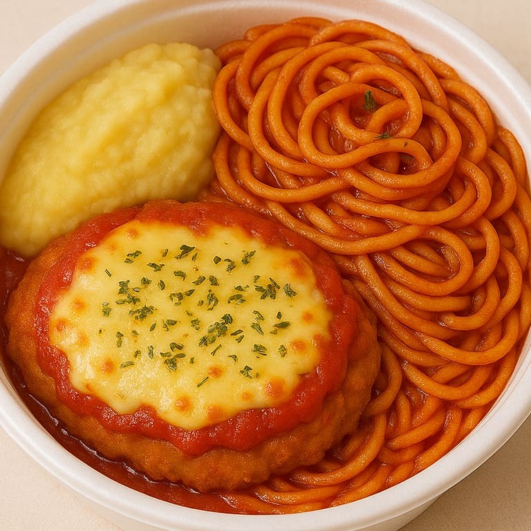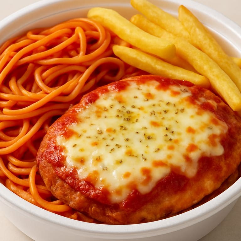 Filé de frango empanado, coberto com molho de tomate, bastante queijo mussarela derretido e toque de orégano. Acompanha macarrão ao molho de tomate e batatas fritas. Uma marmita irresistível, bem servida e perfeita para matar a fome. Serve uma pessoa.