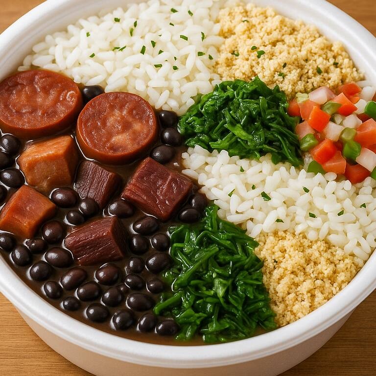 Feijoada completa com feijão preto, com pedaços de bacon, calabresa, charque e pernil suíno bem cozidos. Acompanha arroz branco temperado, couve refogada, farofa crocante da casa e vinagrete fresco. Servida com uma Coca-Cola 250ml.