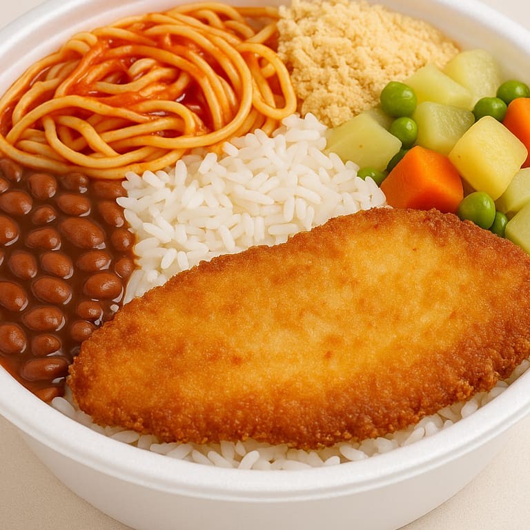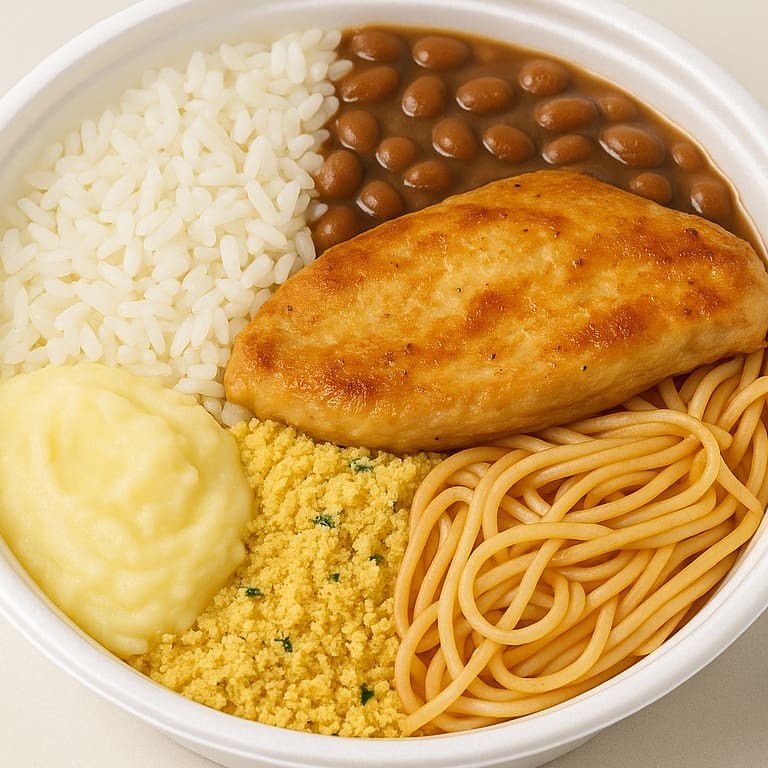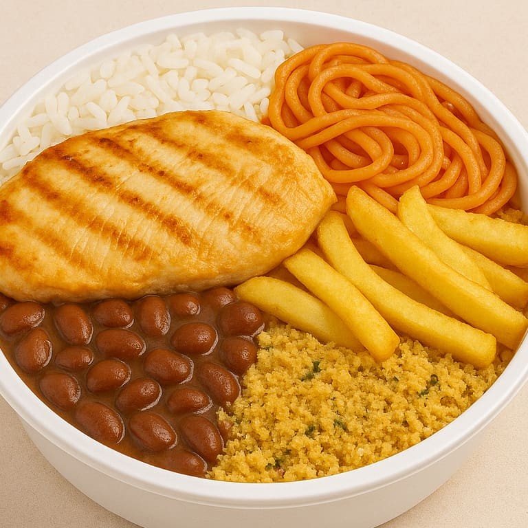 Filé de frango à milanesa crocante, servido com arroz temperado, feijão mulato, macarrão ao molho de tomate, farofa da casa e legumes cozidos (batata inglesa, cenoura, chuchu e ervilhas). Uma marmita completa, farta e com aquele sabor caseiro que conquista. Serve uma pessoa.