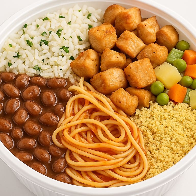 Marmita com frango em cubos temperado, arroz branco soltinho, feijão mulato com caldo, macarrão fino ao molho de tomate, legumes cozidos (batata, cenoura, chuchu e ervilhas) e farofa da casa. Acompanha uma Coca-Cola 250ml gelada. Um combo completo e equilibrado com sabor e refrescância. Serve uma pessoa.