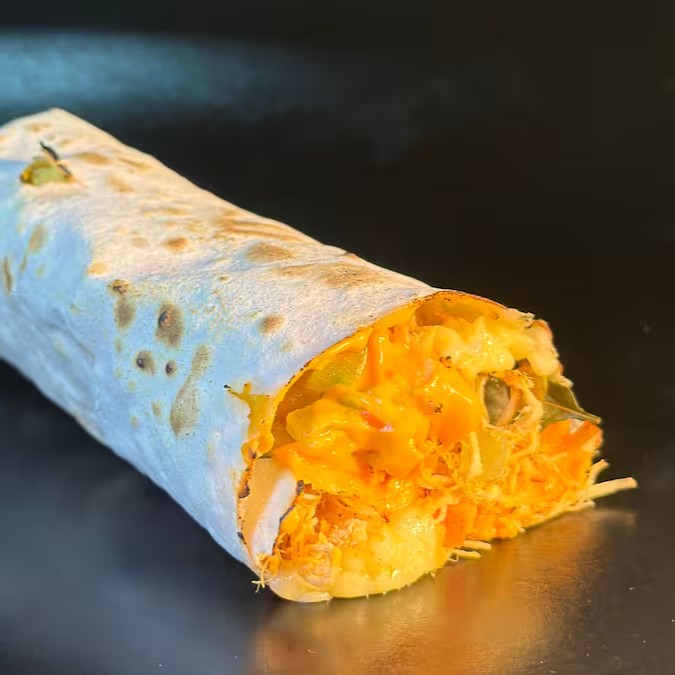 Tortilla de trigo levemente tostada enrolada com recheio de frango desfiado, queijo mussarela, tomates verdes, manjericão e american cheddar. Não acompanha molho à parte. Ótima opção Kids!