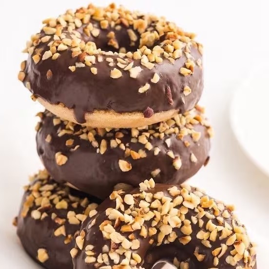 8 Mini Cake donuts de Baunilha com Cobertura de Chocolate com farofa de amendoim por cima. Delicioso na medida certa!