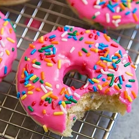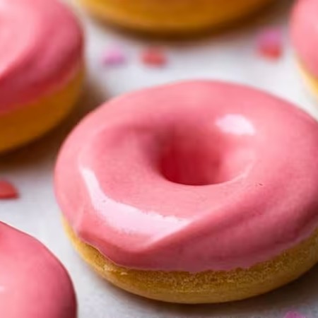 Mini cake donuts de baunilha cobertos com uma deliciosa cobertura rosa. Doce, macio e lindo – perfeito para quem ama um toque delicado e açucarado.