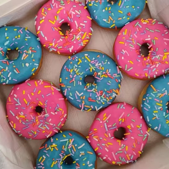 Mini cake donuts inspirados no donut do Homer Simpson! 8 unidades com cobertura rosa e azul de chocolate branco, mais granulado colorido. Divertidos, fofinhos e cheios de sabor… São 4 cobertos com chocolate branco azul e 4 com chocolate branco rosa, todos finalizados com granulado colorido crocante. Perfeitos para dividir, presentear ou se deliciar sozinho(a)!