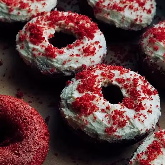 Mini cake donuts macios de massa red velvet, cobertos com creme de chocolate branco e finalizados com pedacinhos crocantes. Sofisticado, delicado e irresistível!