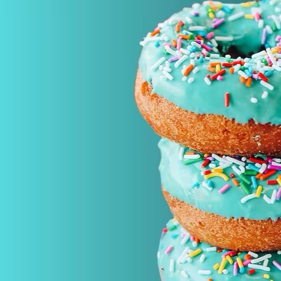 Porção com 8 Mini cake Donuts de Baunilha com cobertura azul de chocolate branco e granulados coloridos. Uma explosão de sabor e cor em cada mordida
