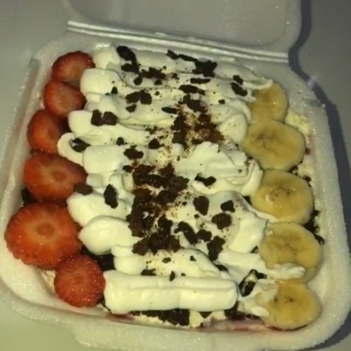 Açaí, leite Ninho, granola, banana, e leite condensado.