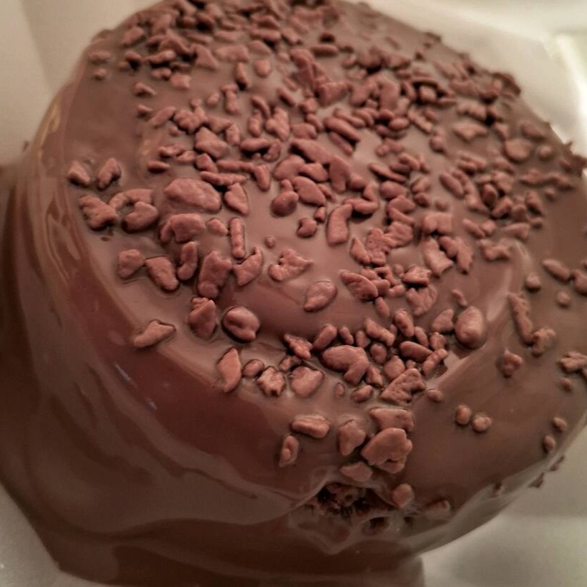 Nossa massa fofinha de chocolate, com recheio de brigadeiro de chocolate, finalizado com pedaços de brownie