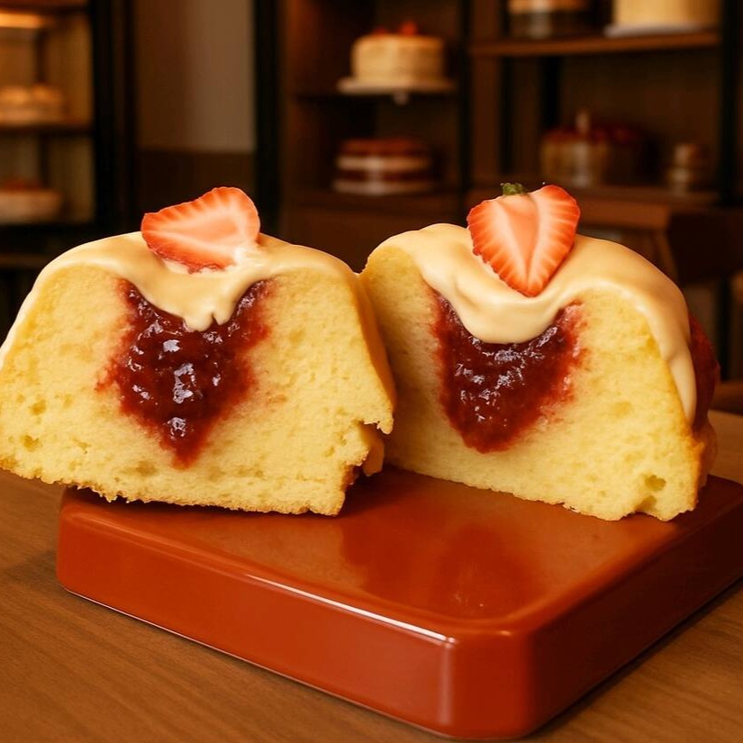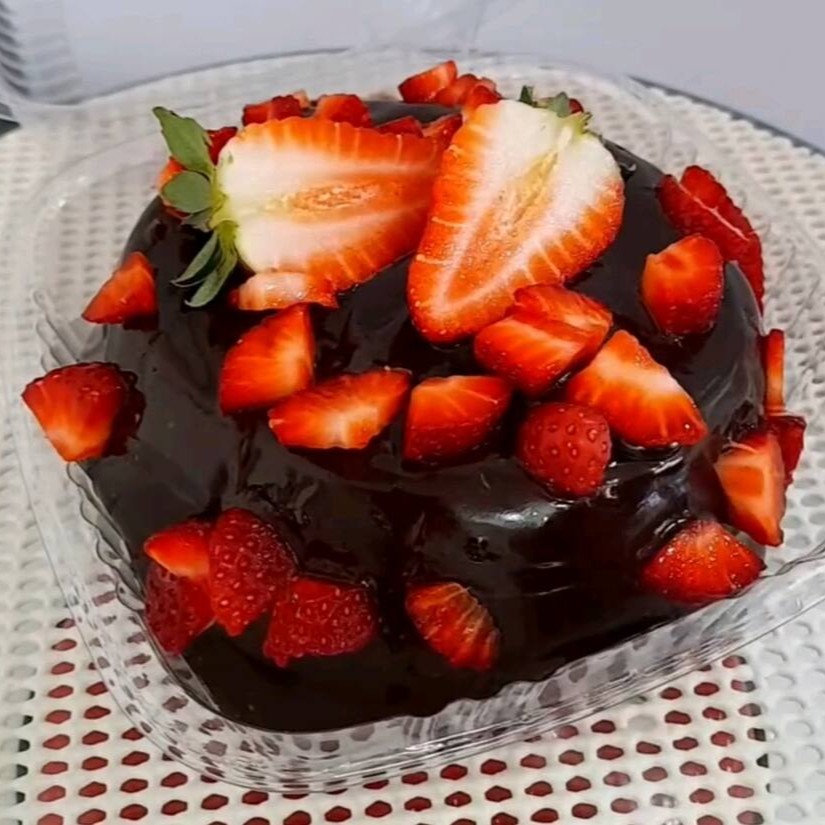 Nosso caseirinho delicia de morango, com massa fofinha branca, recheada com geleia artesanal de morango, coberto com brigadeiro de Ninho, finalizado com morango.