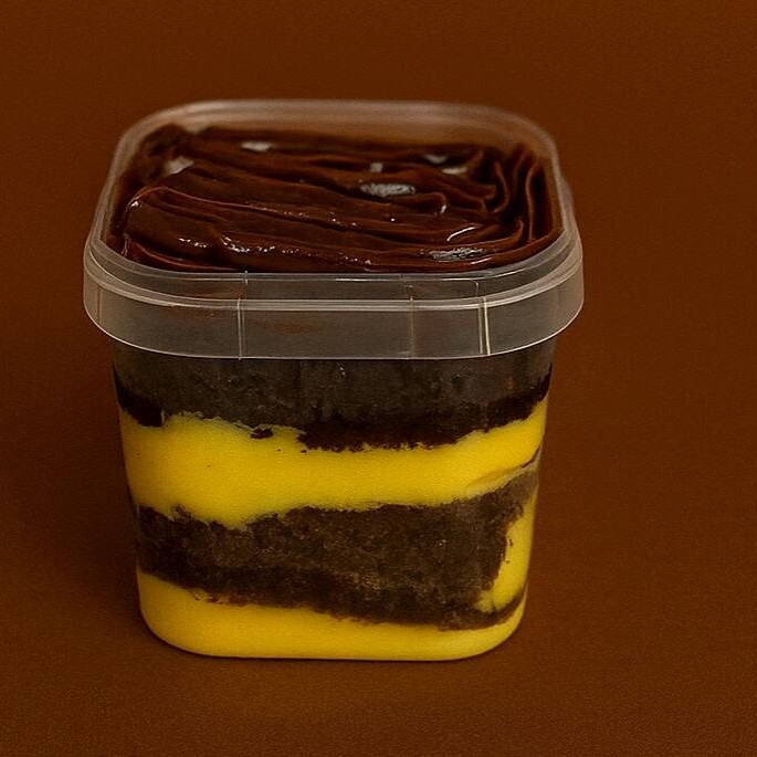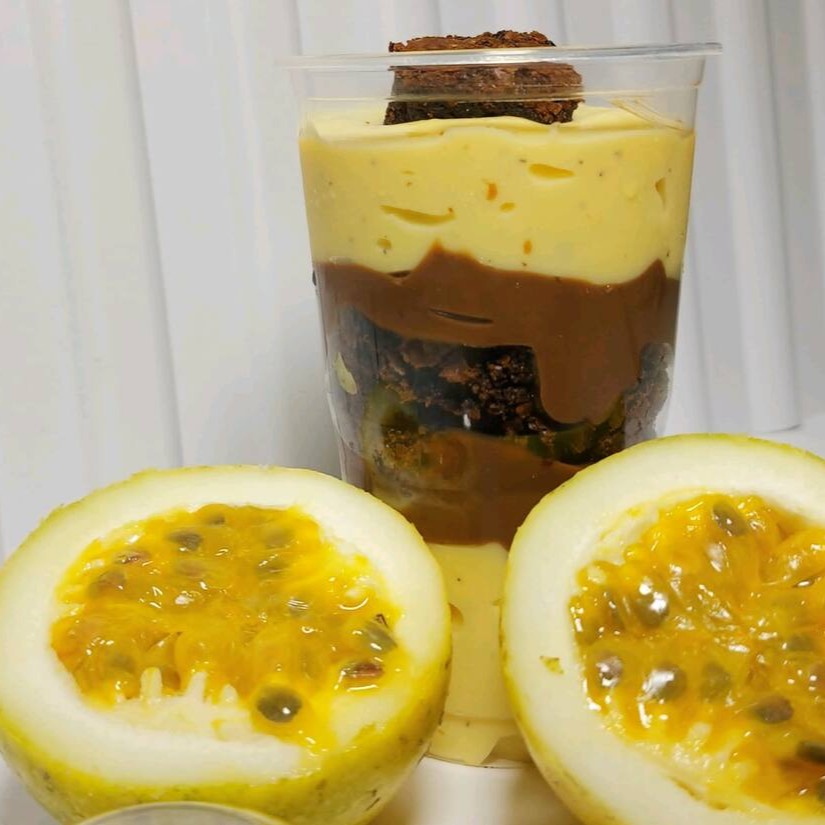 Nosso bolo no pote com brigadeiro de maracujá, massa de chocolate, finalizado com brigadeiro 50%