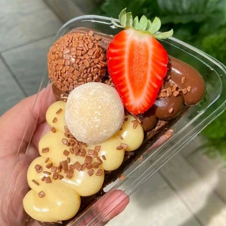 Nossa terça 1lt, com brigadeiros ninho, brigadeiro 50% cacau, morangos frescos, brownie finalizado com morango e brownie