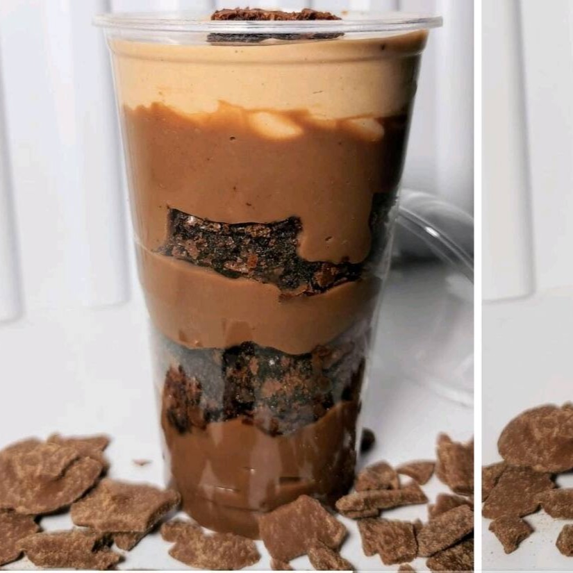 Nosso copo da felicidade chocolatudo tem como base brigadeiro 50%, duas camadas de brownie, finalizado com mouse de chocolate