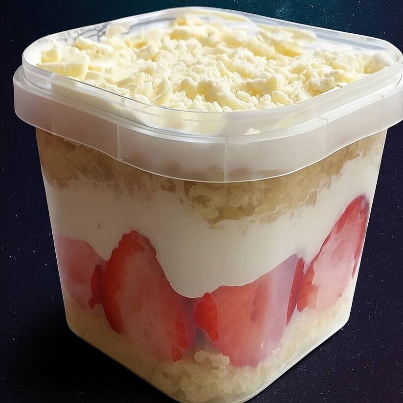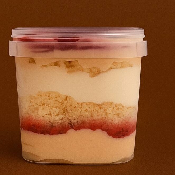 Nosso bolo no pote com massa branca amanteigado, brigadeiro branco, geleia artesanal de morango, mouse de Ninho.