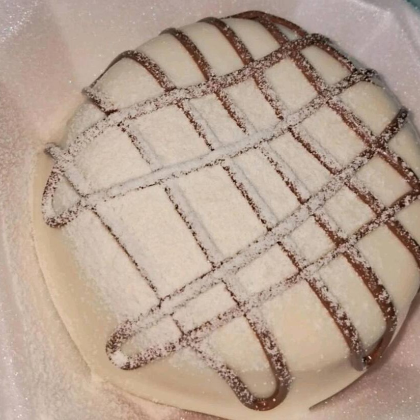 Nosso bolo na massa branca, recheio de Ninho, com fios de Nutella