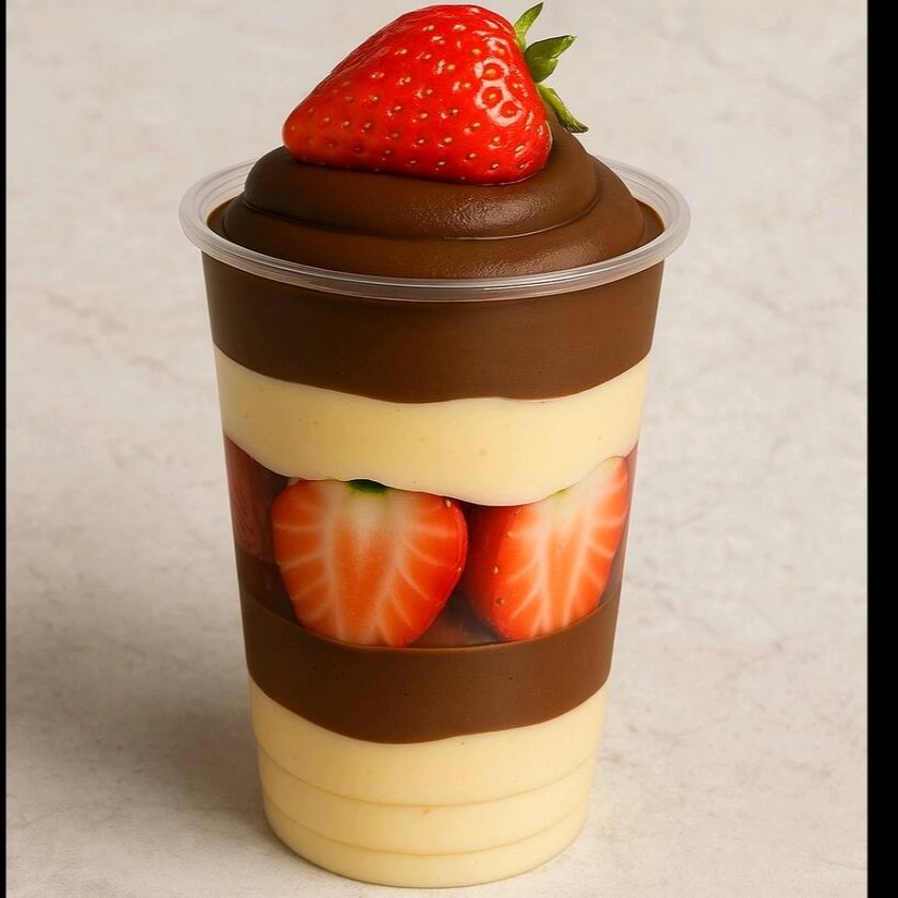 Nosso copo da felicidade supremo dois amor com brigadeiro cremoso 50% e nosso brigadeiro branco, com morangos frescos