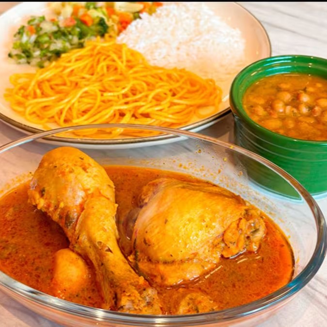 Galinha guisada com aquele sabor de comida feita em casa, acompanhada de arroz branco temperado, espaguete ao molho sugo e salada de legumes fresquinhos. Uma refeição completa e irresistível — cerca de 500g de puro sabor caseiro!