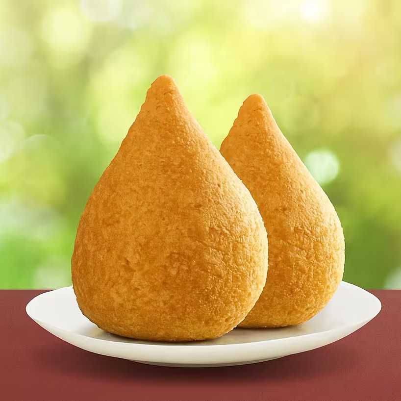 Deliciosa coxinha de massa de batata, com recheio de frango. Nossos salgados são assados na hora.