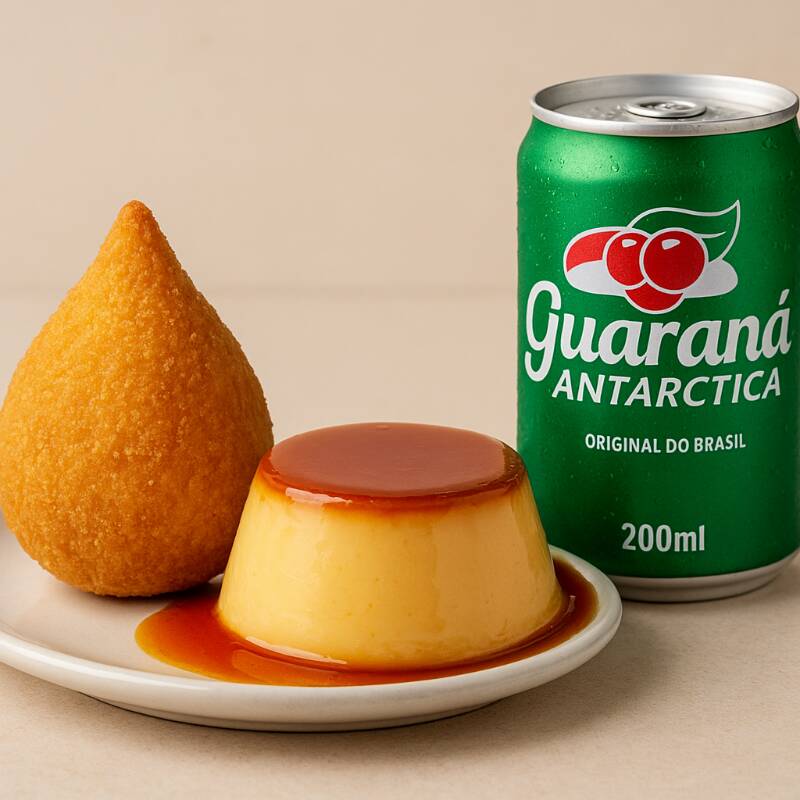 Oferta Executiva: Delicie-se com 1 coxinha de frango suculenta, acompanhada de 1 pudim cremoso e 1 Guaraná Antártica 200 ml geladinho. Um combo perfeito para sua pausa!