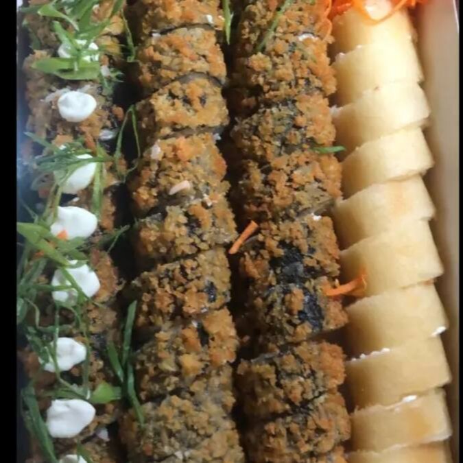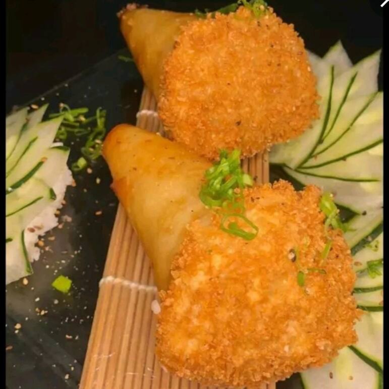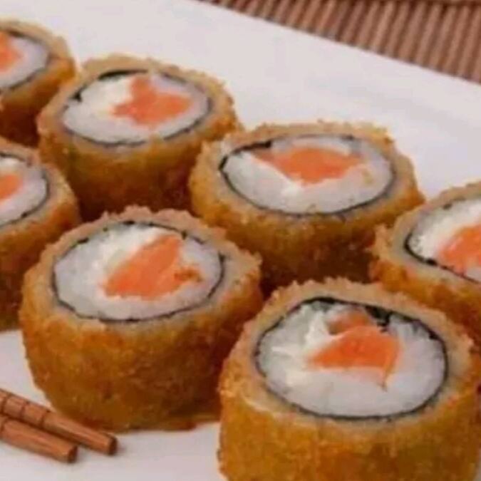 Massa de harumaki, arroz, creme chees, empanado e frito.