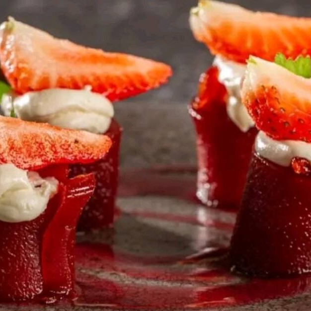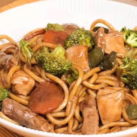 Carne , frango , legumes , molho especial e macarrão . Rolinho de chocolate
