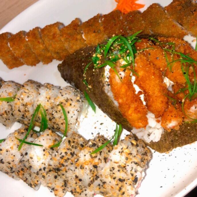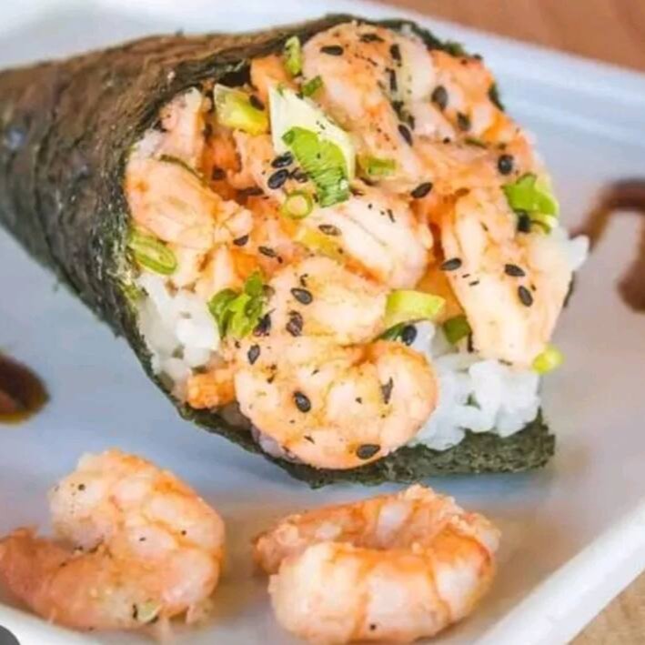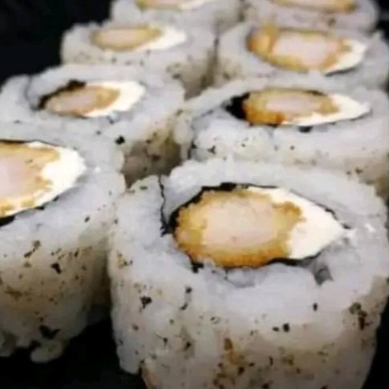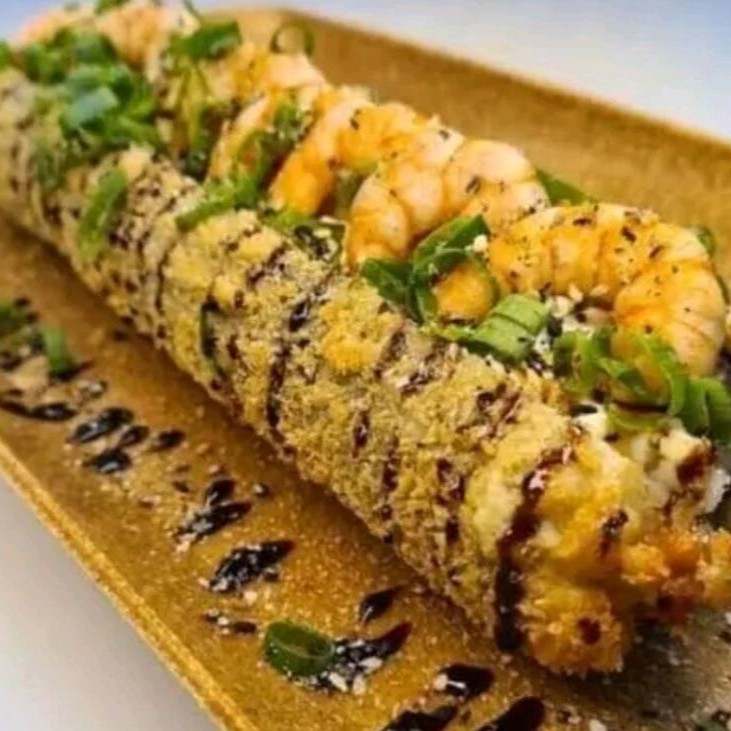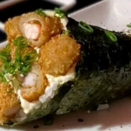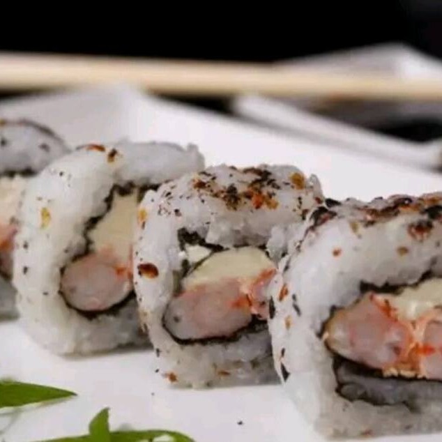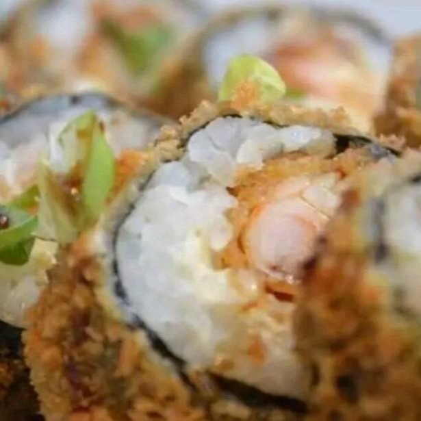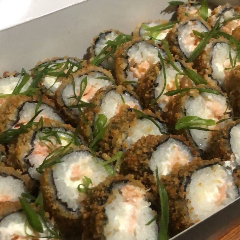 Nori, arroz, cream cheese, camarão empanado, gergelim , e um toque de Cebolinha