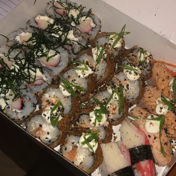 10cariocas salmão grelhado, 10 cariocas de skin , 10 uramaki de skin , 10 uramaki de camarão , 10 uramaki de kani.