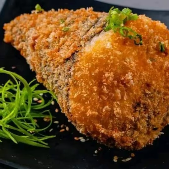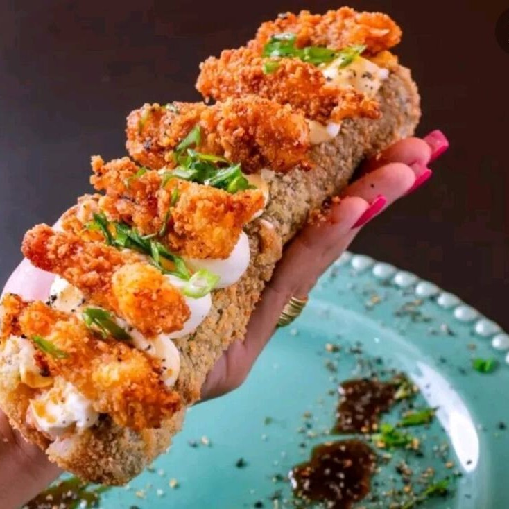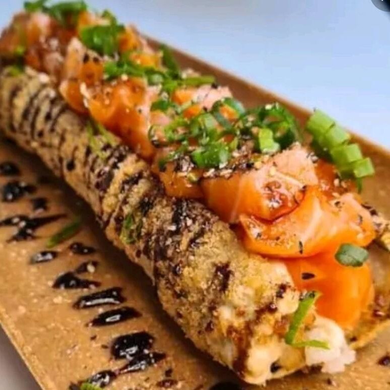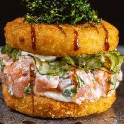 Sushi burguer arroz empanado e frito , cremes chees , salmão e couver crispi e cebolinha.