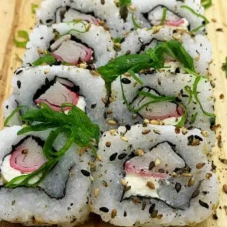 Nori, arroz, cream cheese, kani, gergelim, toque de Cebolinha