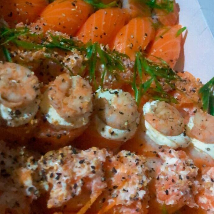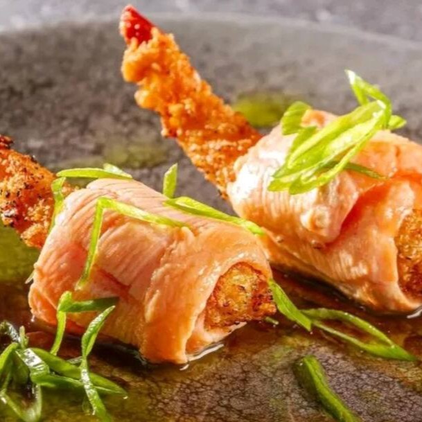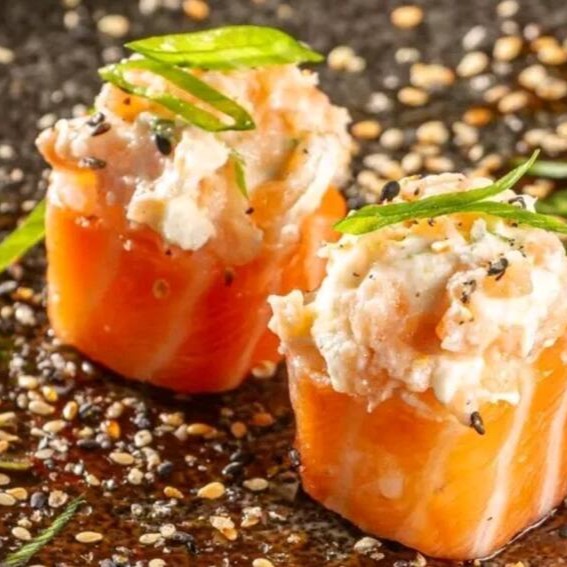 Camarão empanado, lâmina de salmão ,cream cheese, maçaricado