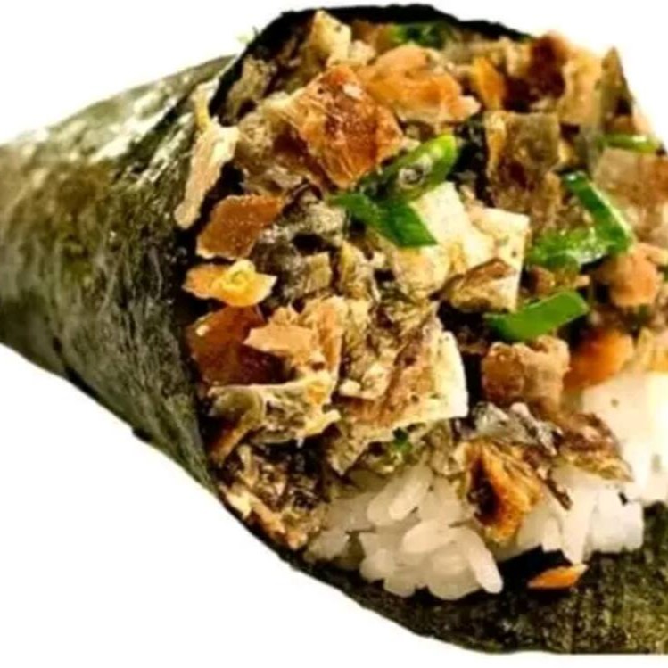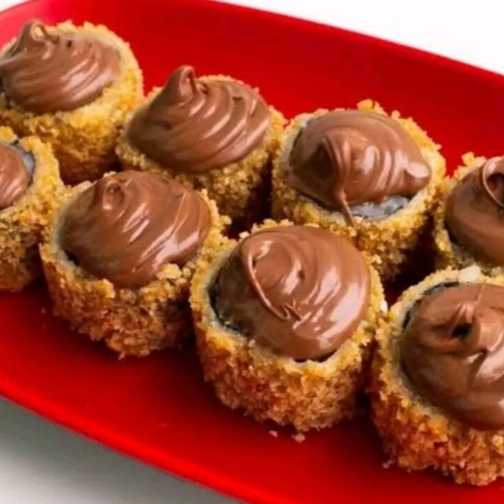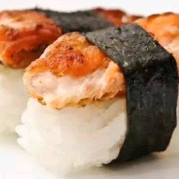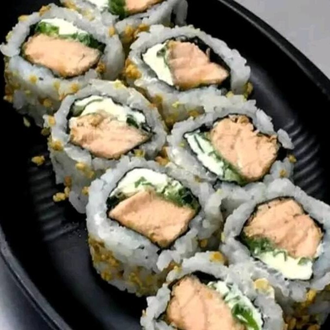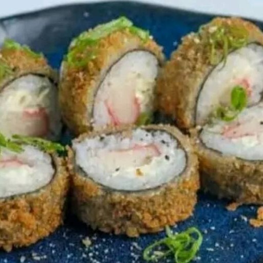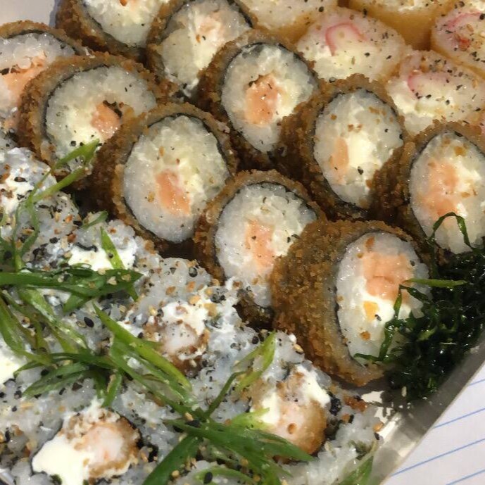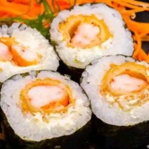Nori , arroz , creme chess e salmão , camarão ou kani. Empanado