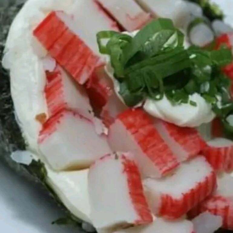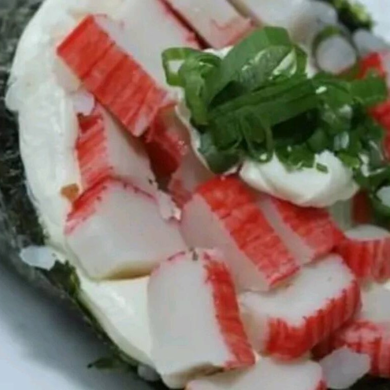 Enrolado de arroz e cremes chess frito , com creme chees em cima e kani .