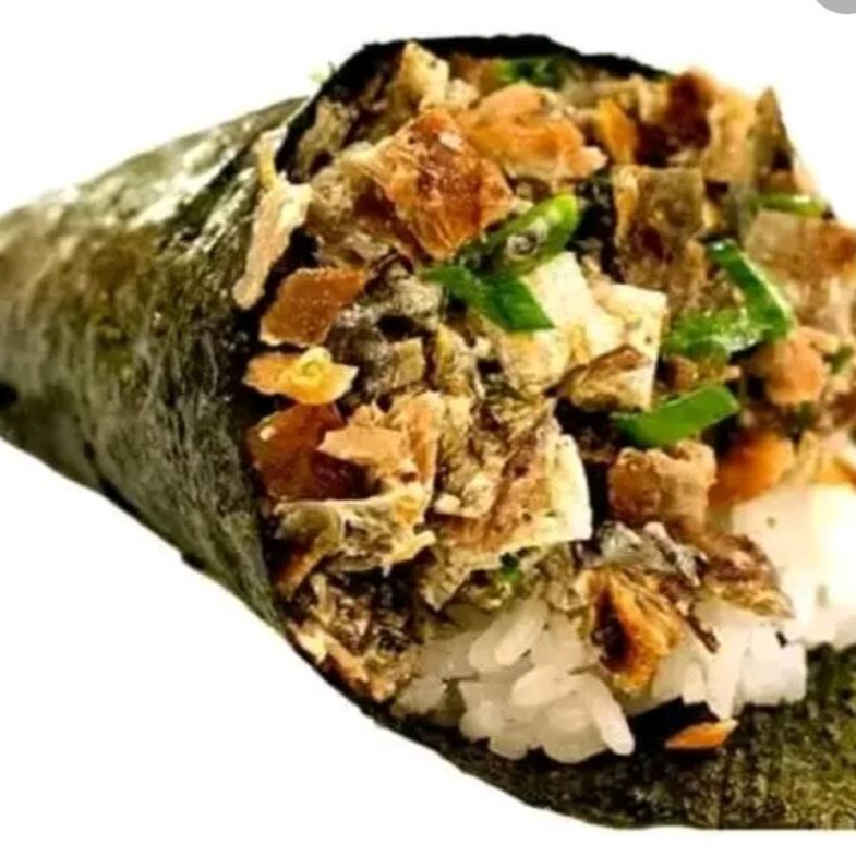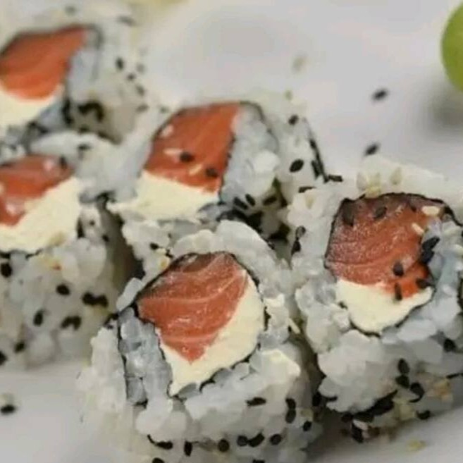Nori, arroz, cream cheese , salmão, gergelim e Cebolinha.