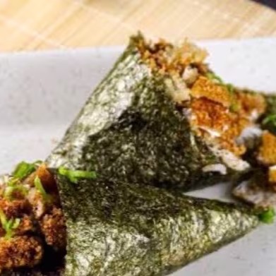 Dois temaki de camarão, com arroz, creme chees, camarão empanado Cebolinha, e gengilim