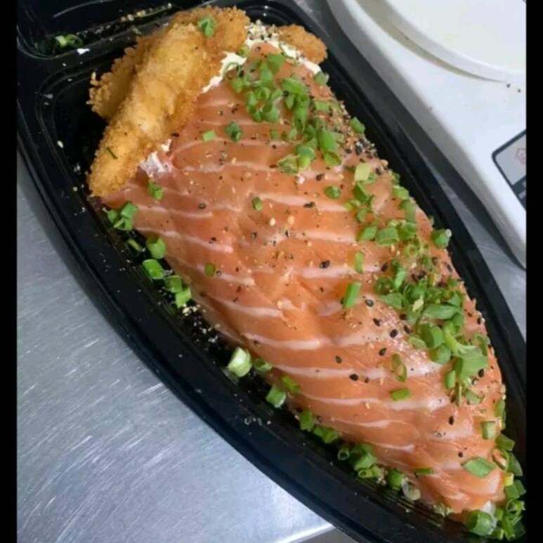 Arroz , lâmina de salmão, creme chees em cima, camarão natural.