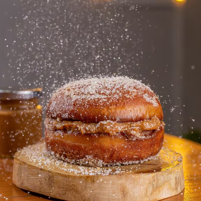 Apresentamos a nossa sobremesa estrela: o hamburguinho tipo 'sonho', uma autêntica joia da confeitaria. Sua massa leve e delicada esconde um recheio de doce de leite extremamente cremoso, que derrete na boca, proporcionando uma experiência única de sabor. Para completar, este pequeno prazer é generosamente polvilhado com açúcar e canela, criando um equilíbrio perfeito entre doçura e especiaria. Uma delícia que vai fazer você suspirar a cada mordida!