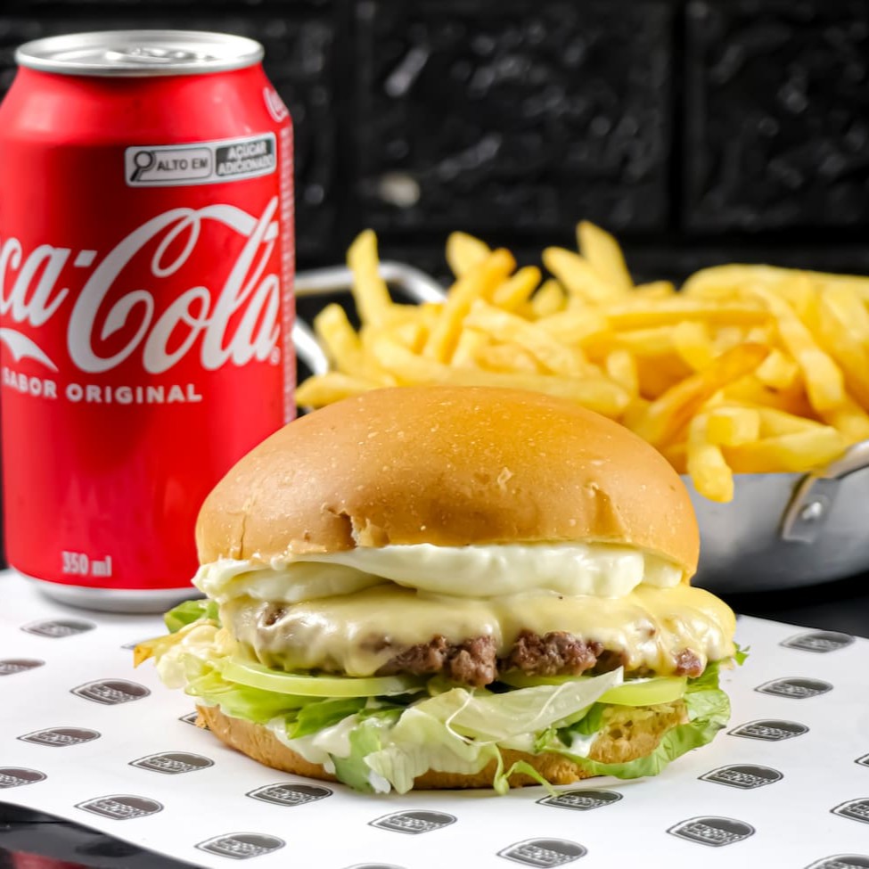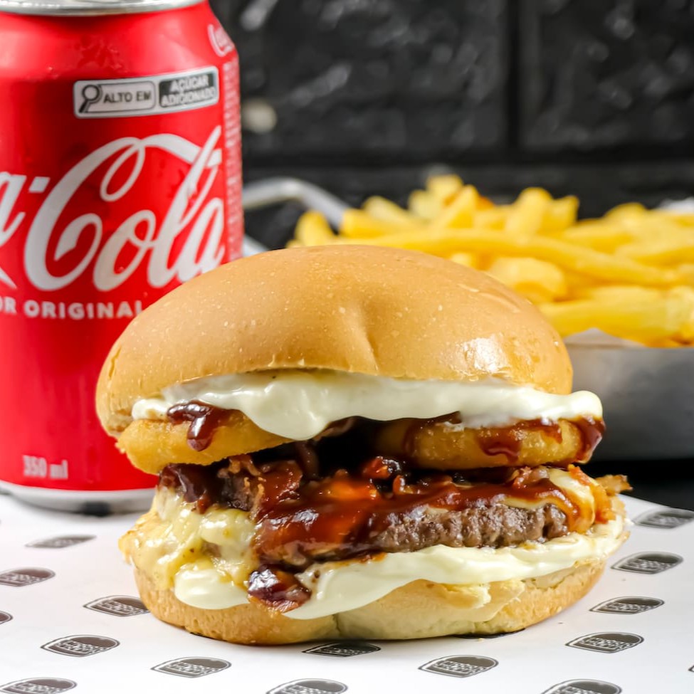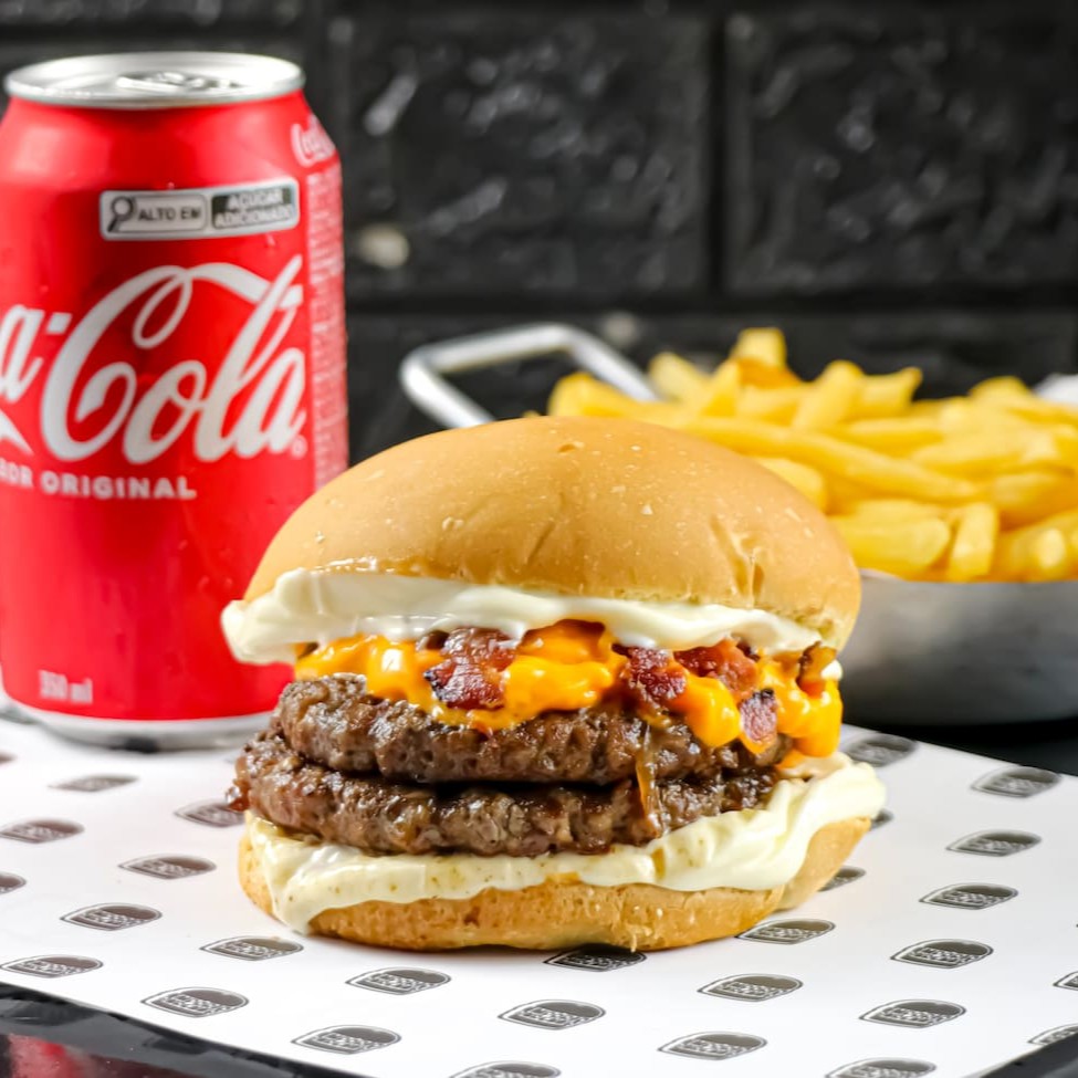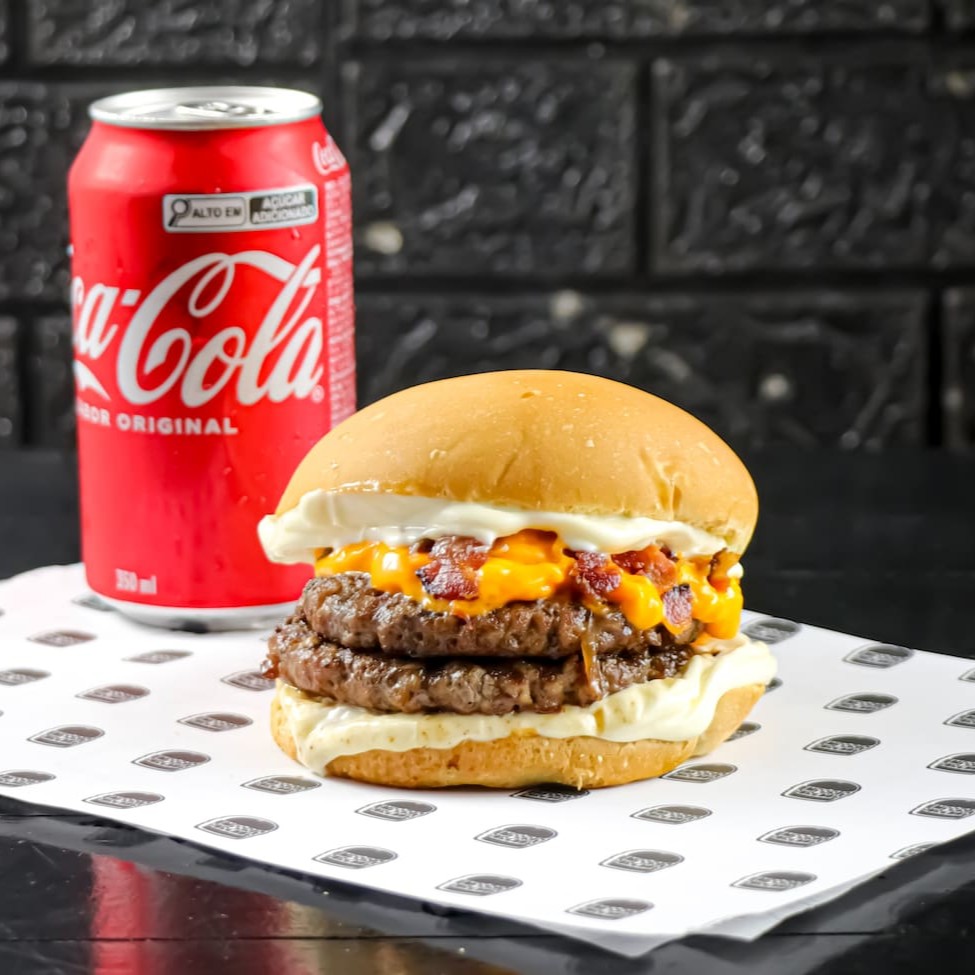 Pão amanteigado, 2 carnes bovinas suculentas, cheddar artesanal, bacon, cebola caramelizada e a maionese do chef — tudo isso com uma Coca Lata geladinha pra acompanhar!
