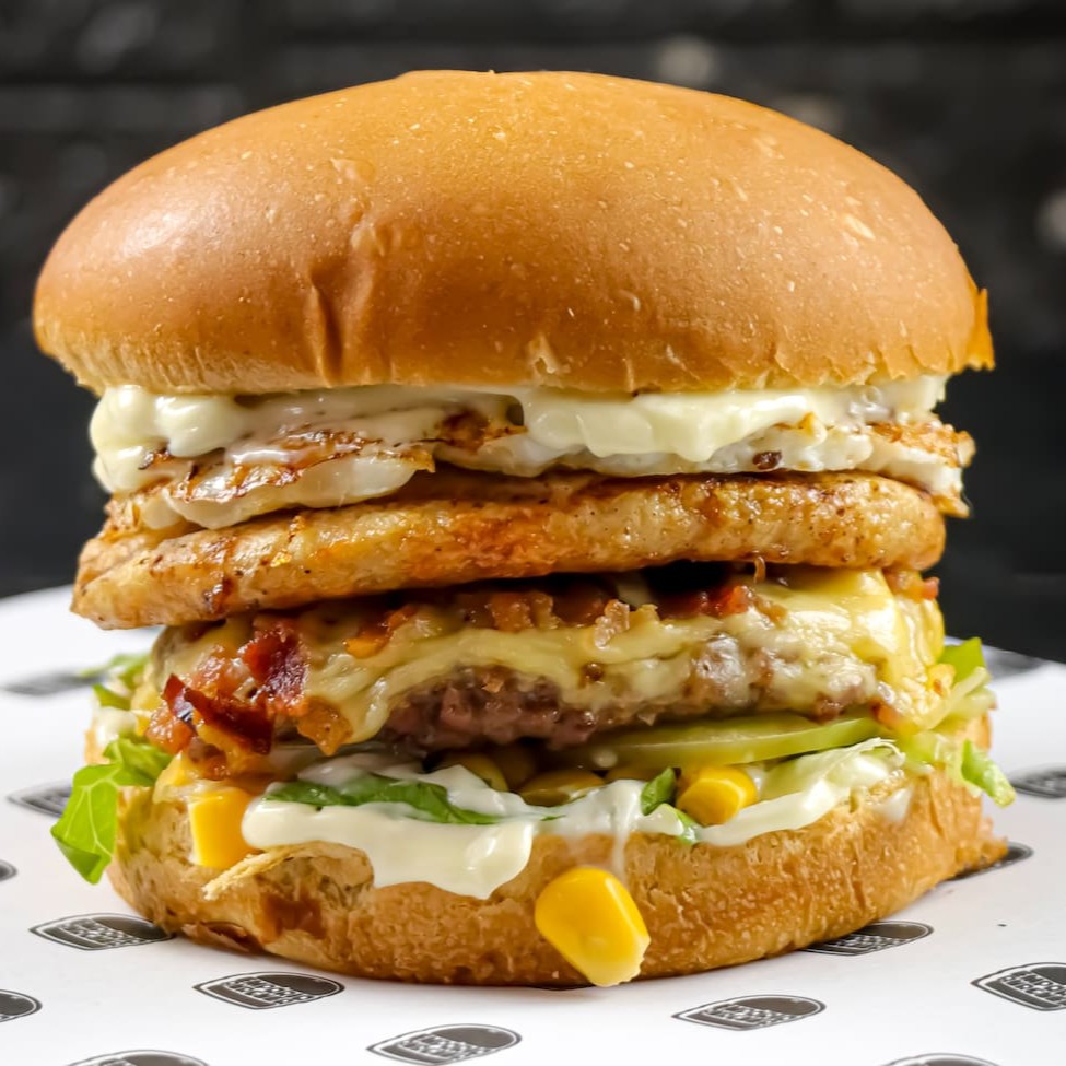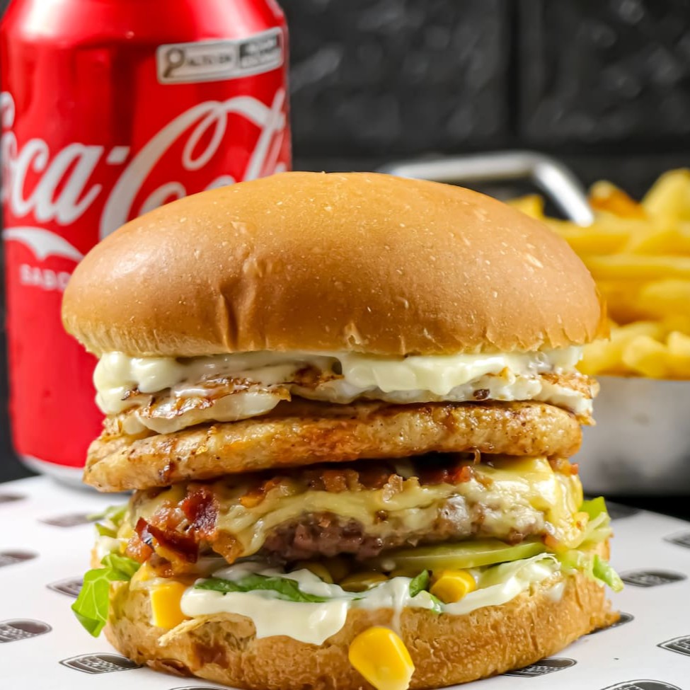 Carne bovina suculenta + hambúrguer de frango bem temperado, bacon macio, milho crocante, tomate suculento, alface fresca e a maionese clássica do chef. Uma explosão de sabores que vai te surpreender!