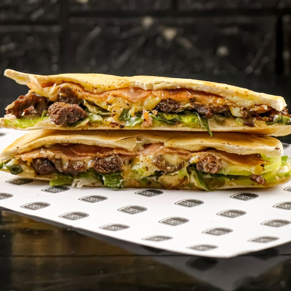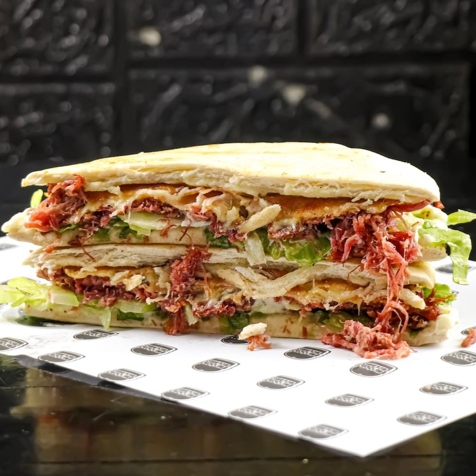 Charque desfiada no pão sírio fresquinho, com queijo prato derretido, peito de peru defumado, orégano, tomate, alface crocante e a maionese especial do chef. Um verdadeiro festival de sabores! (Nossos Beirutes não acompanham batatas)