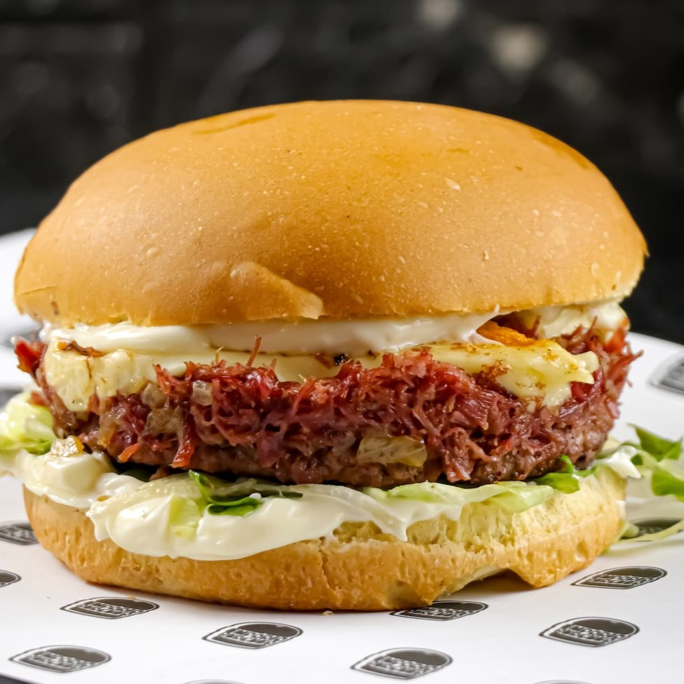 Charque refogada na manteiga de garrafa, bem soltinha e temperada, com queijo coalho tostado e crocante, hambúrguer de 110g, alface fresquinho e a maionese do chef que dispensa comentários. Uma explosão de sabor!