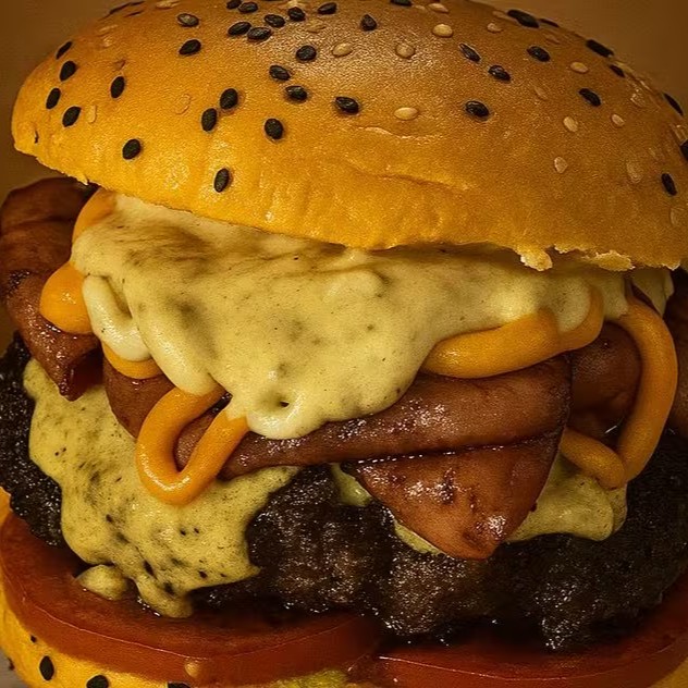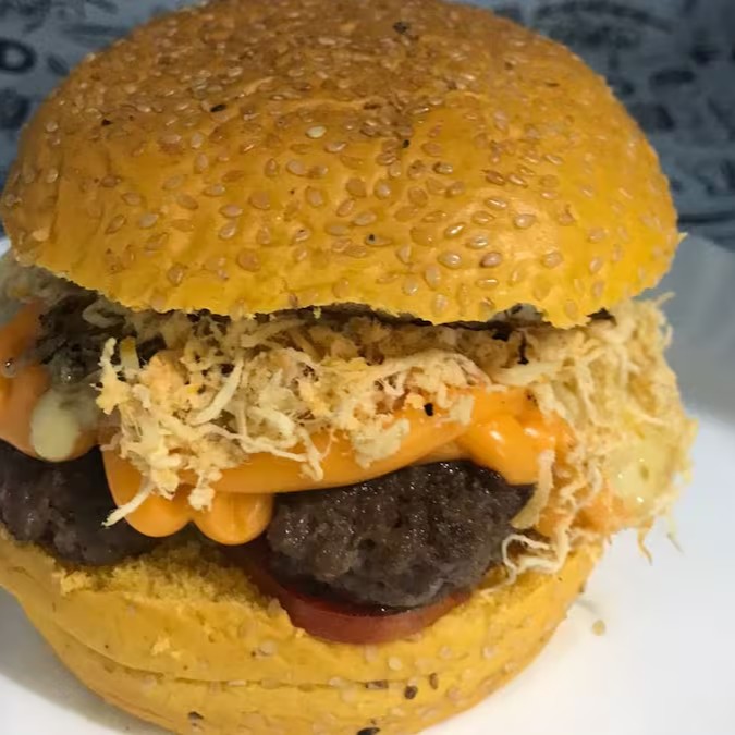 Pão, Burguer no Blend de Carne (160gr), Suculento Frango, Queijo Mussarela, Cream Cheese, Alface e Tomate e Nosso Molho Especial.