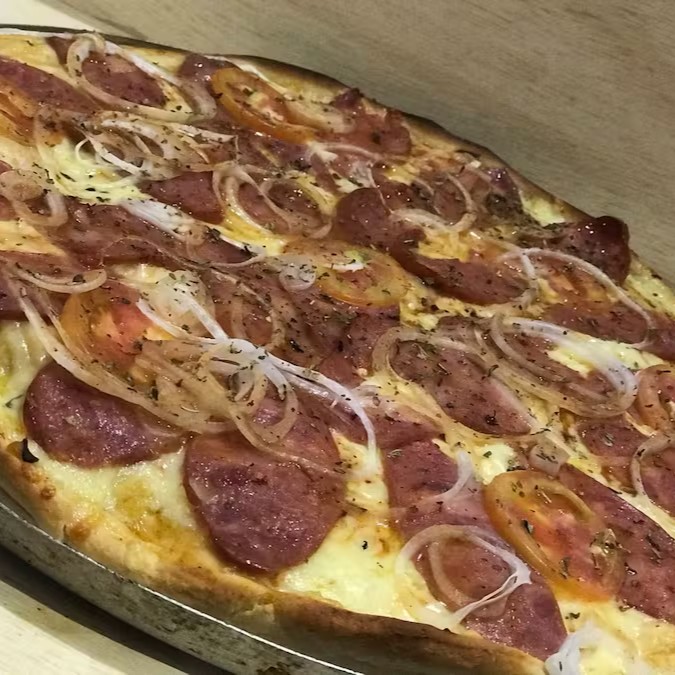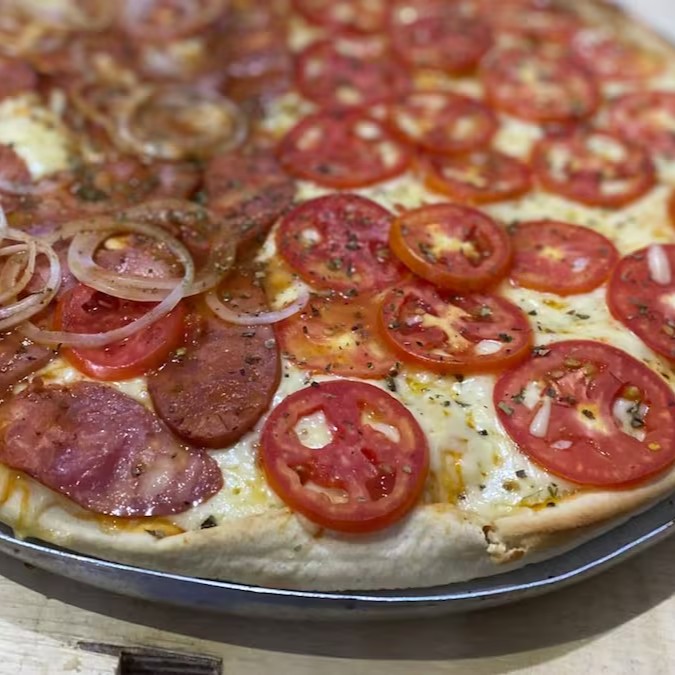 Calabresa: Massa Artesanal, Calabresa Fatiada, Queijo Mussarela, Cebola, Tomate, Azeitona, Molho de Tomate Caseiro Finalizada com Orégano.