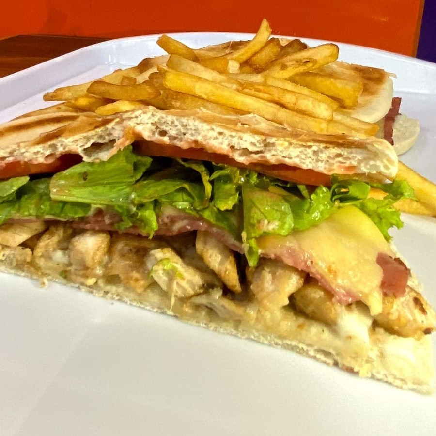Pão Sirio, file de frango em cubos, queijo mussarela, presunto, salada, 130g de batata frita, molho especial.