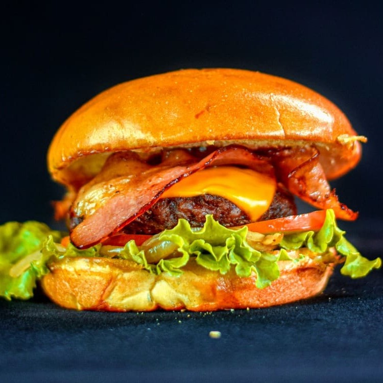 Pão brioche, Blend bovino de 120g, fatia de cheddar, bacon, maionese Secreta, barbecue cebola na chapa, tomate, alface.