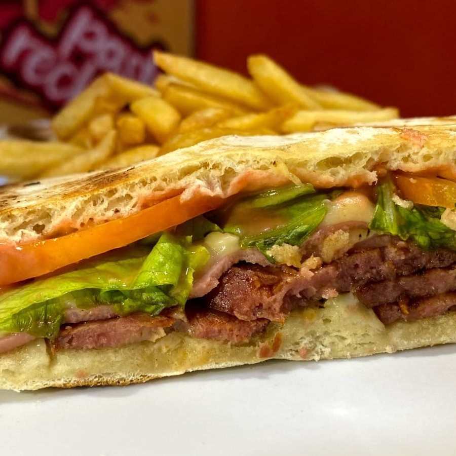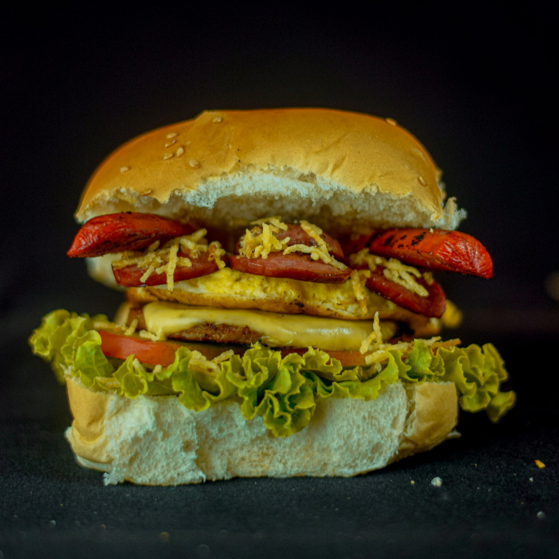 Pão Tradicional, 75g de Carne, Mussarela, Ovo, Bacon, Calabresa, Salsicha, Batata Palha, Tomate, Cebola, Alface.