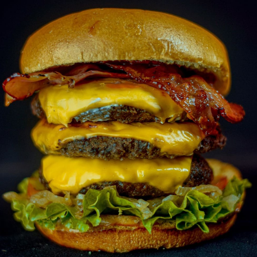 Pão brioche, 3 carne artesanal de 120g, 3 fatias de queijo cheddar, maionese secreta, barbecue, cebola na chapa, tomate, alface.