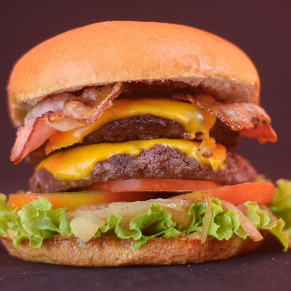 Pão brioche, 2 carne artesanal de 120g, 2 fatias de queijo cheddar, bacon, maionese secreta, barbecue, cebola na chapa, tomate, alface.