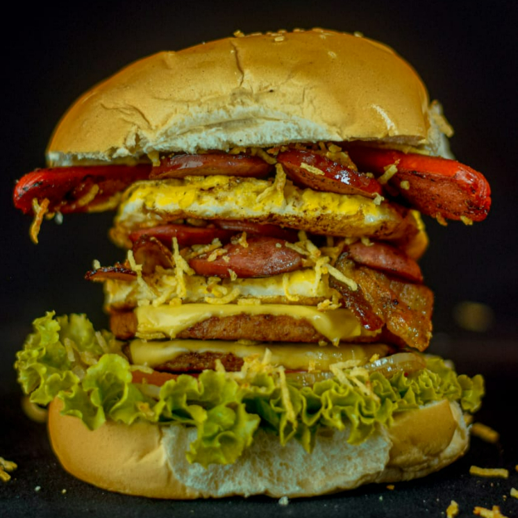 Pão Tradicional, 2 Carne de 75g, 2 Fatia de Mussarela, 2 Ovo, Bacon, 2 Calabresa, Salsicha, Batata Palha, Tomate, Cebola, Alface.